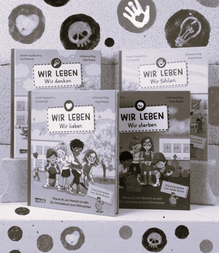 Im August ist unsere vierbändige Buchreihe “Wir leben” im Carlsen Verlag erschienen – nach drei Jahren langer Arbeit. Es geht um vier große philosophische Themen: Das Fühlen, das Denken, das Sterben und das Lieben. In einem Kollektiv mit drei weiteren Autorinnen und einem tollen Team sind vier interaktive Vorlesebücher entstanden, vorgestellt von der Grundschulklasse 1b aus der Wiesenbergschule und immer unter den fürsorglichen Augen ihrer Lehrerin Frau Prix, die selbst auch noch ganz schön viele Fragen an das Leben hat. Dazu gibt es jede Menge kreative Denkimpulse, vertiefendes Material für die pädagogische Arbeit in der Grundschule und – eine eigene Website, für mehr Informationen klicken Sie hier