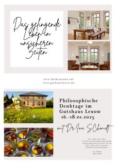 Mitten in der Winterlandschaft der Mecklenburger Seenplatte wollen wir das neue Jahr begrüßen – nachdenklich im besten Sinne mit Zeit für das Denken selbst. Vom 16.-18.01.2026 sind wir zu Gast im Gutshaus Lexow und lassen uns in diesen drei Denktagen geistig und kulinarisch verwöhnen. Ich freue mich auf Sie und Euch. Für nähere Informationen und Buchung melden Sie sich gern bei mir: ina.schmidt@denkraeume.net